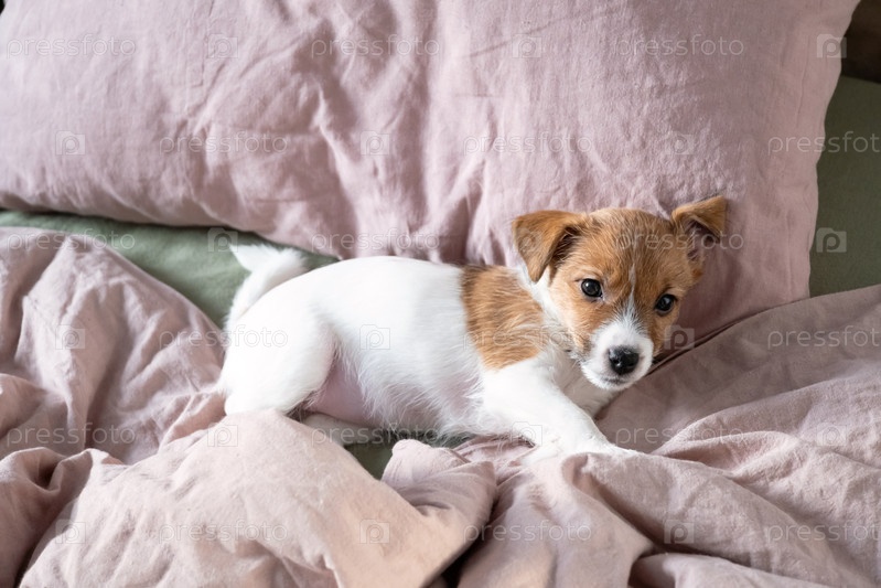 Милый щенок, лежащий на мягкой кровати.Очаровательное расслабление домашнего питомца на уютных простынях