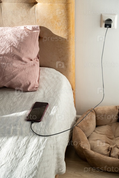 Зарядка смартфона на кровати с кроватью рядом