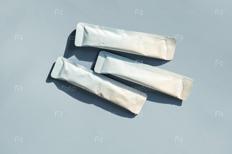 Три пустых пакета мешков из фольги на синем фоне с твердыми тенями