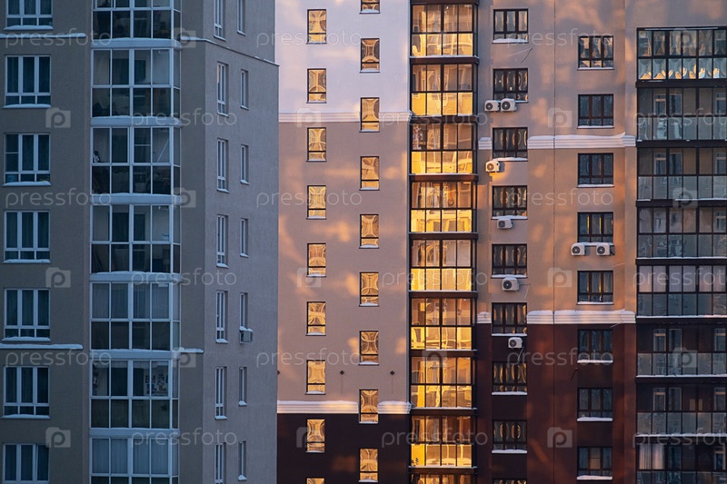 Городской ландшафт с современными многоэтажными зданиями на восходе солнца