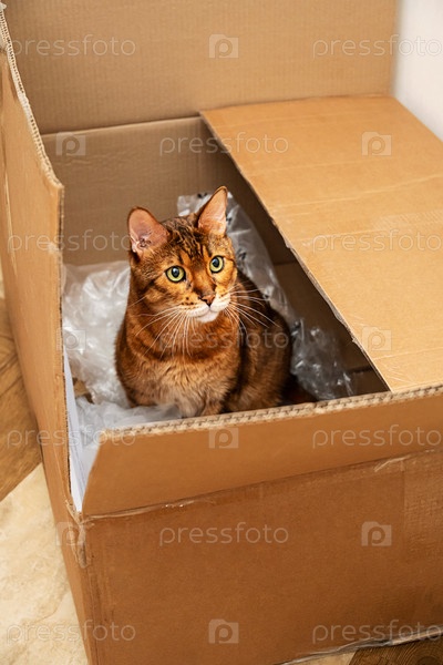 Милый кот внутри картонной коробки, играющий в открытом пакете с любопытными глазами и забавным выражением дома
