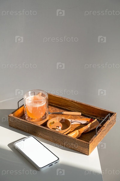 Деревянная поднос с напитком, добавками и смартфоном на белом столе
