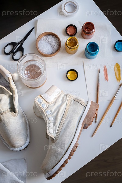 Белая обувь, бутылки с краской и кисти для проекта настройки обуви