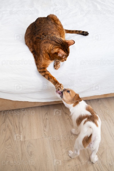 Кошка, играющая с щенком. Забавное взаимодействие домашних животных, дружба и сосуществование