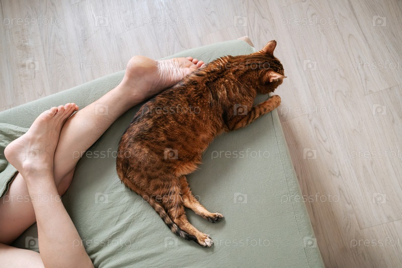 Мужские ноги рядом с бенгальской кошкой, спящей на зеленом постельном белье