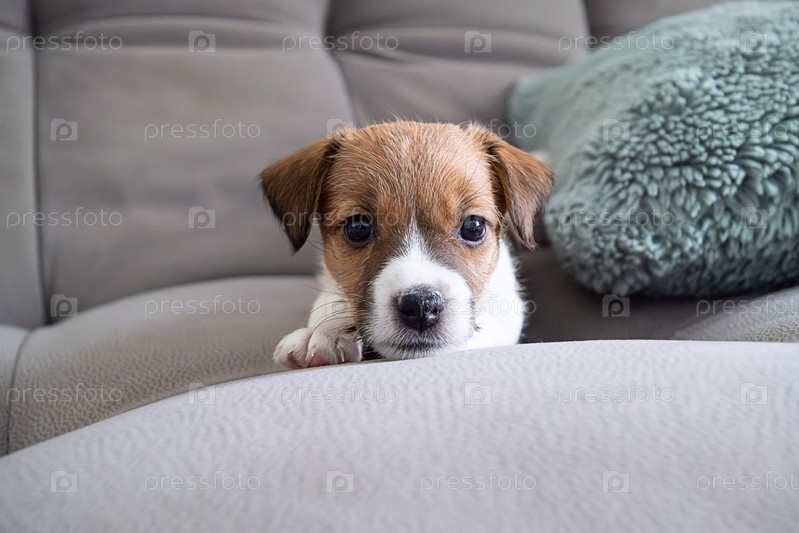 Милый щенок заглядывает на серый диван, собака выглядит прямо любопытно