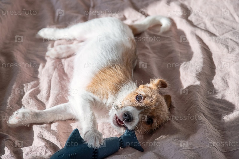 Милый щеночек с белым и коричневым мехом, играющий в игрушку в форме акулы на уютном одеяле