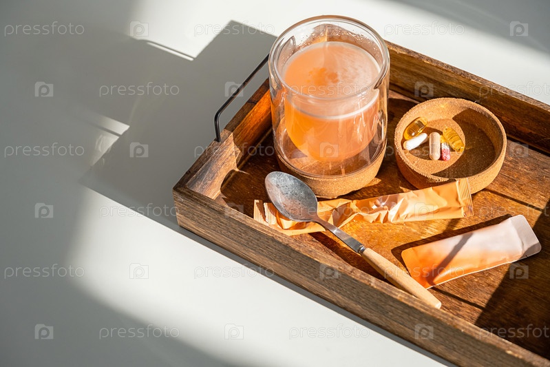 Освежающий стакан напитка на деревянной подносе с витаминами, добавками, ложкой и порошковыми пакетами