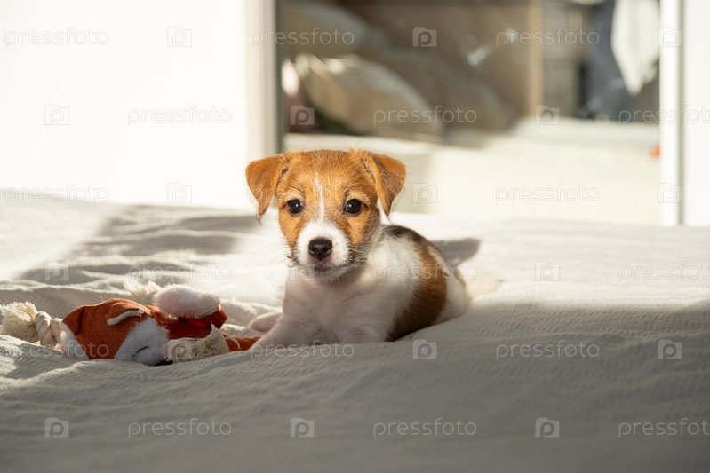 Маленький щеночек лежит на кровати рядом с игрушкой