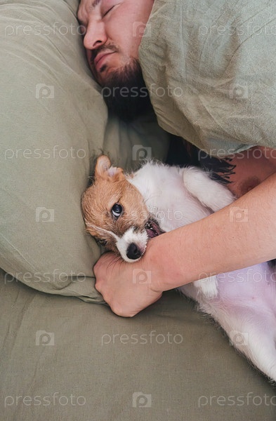 Мужчина спит в постели с игривым щенком.Владелец питомца общается с собакой