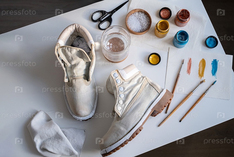 Белые туфли на белом столе, окруженные художественными материалами для персонализации обуви