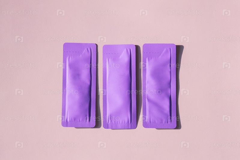 Три фиолетовых косметических пакета на светло-розовом фоне