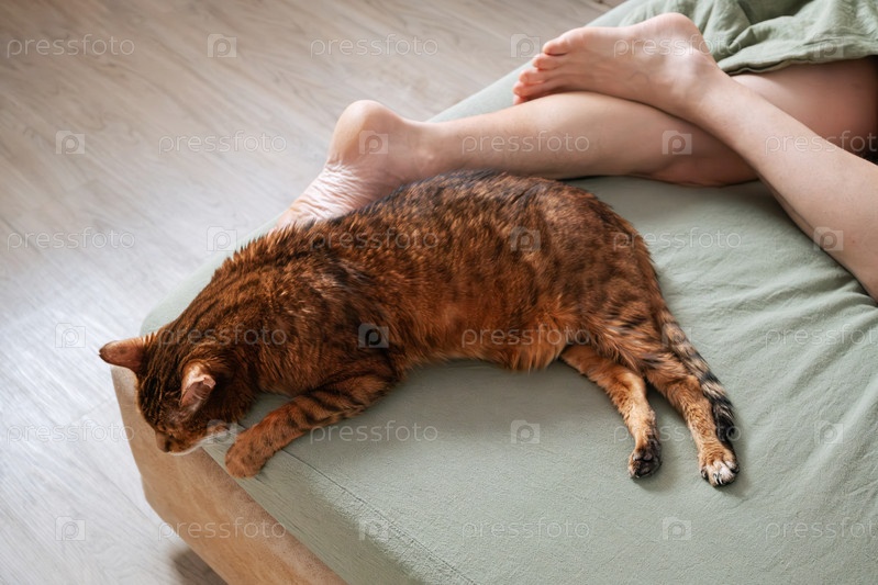 Коричневый котенок спит на кровати рядом с мужскими ногами