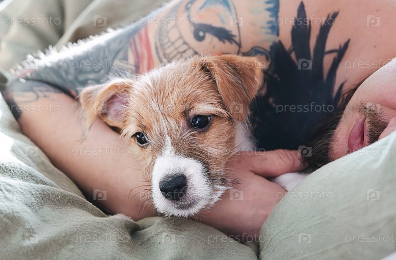 Щенок лежит на мужской руке с татуировками, концепция комфорта