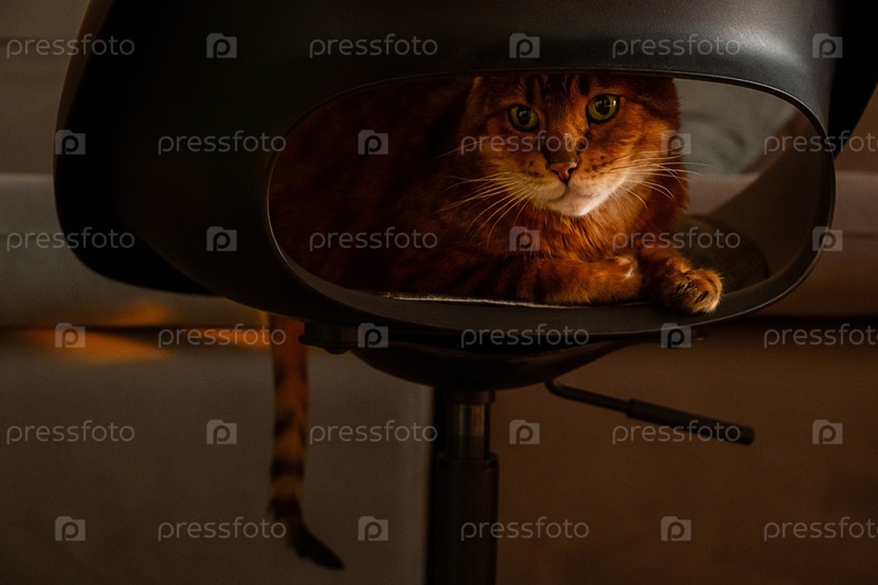 Имбирная кошка с зелеными глазами удобно сидит внутри темного современного стула