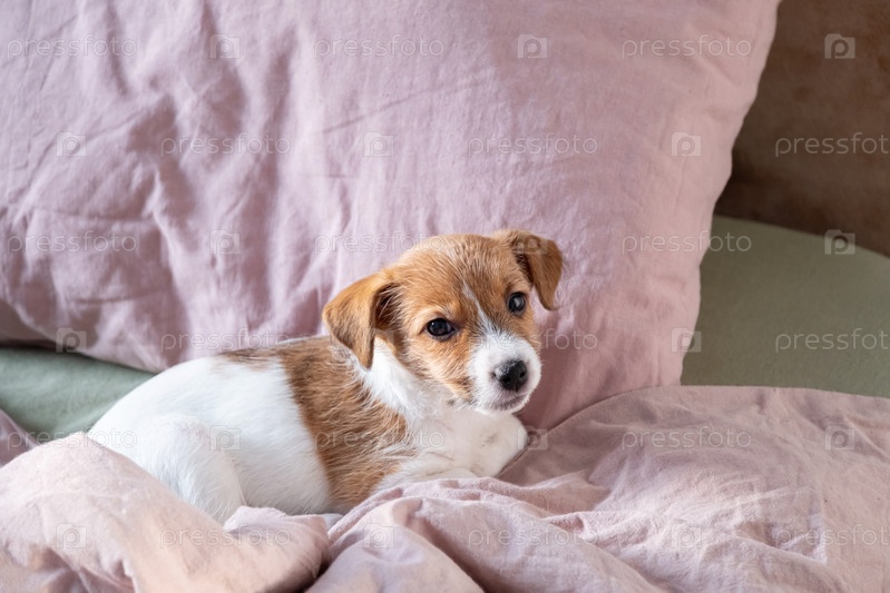 Милый щеночек, отдыхающий на розовом одеяле и подушке