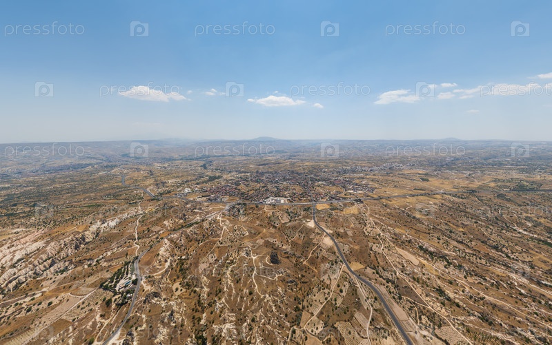 Гореме, Невшехир, Турция.Авиационный вид на плато Каппадокии в яркий летний день показывает обширные открытые пространства, сухие луга и далекие холмы под безоблачным небом