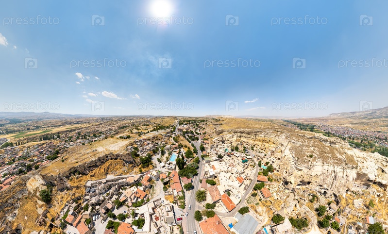 Ургуп, Невшехир, Турция. широкий панорамный вид на город с многочисленными пещерными отелями, высеченными в скалистых утесах в летний день
