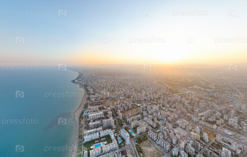 Мерсин, Турция. широкий панорамный вид на береговую линию Мезитли, простирающийся до горизонта в золотое время суток. Средиземное море, песчаный пляж и жилой горизонт вдоль побережья. взгляд с воздуха