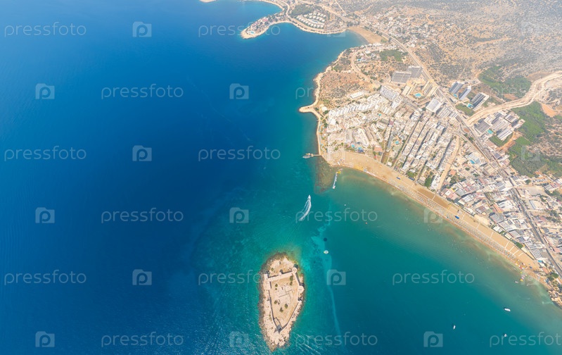 Кизкалеси, Мерсин, Турция. вид с воздуха островной крепости Девичьего замка, переполненные песчаными пляжами со зонтиками, бирюзовым Средиземным морем и прибрежным городом