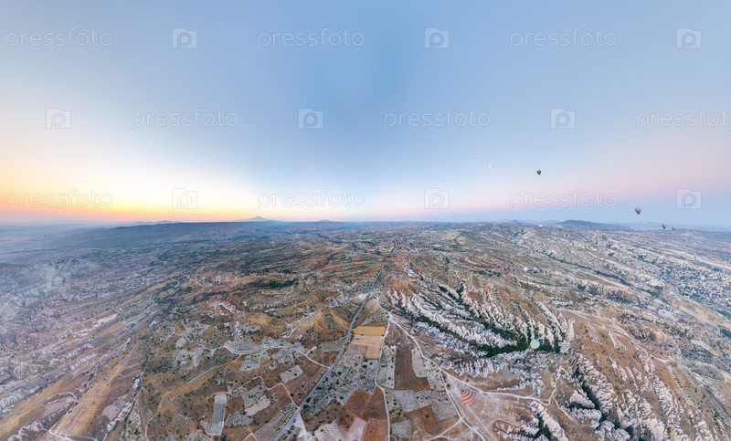 Огромная панорамная картина плато Каппадокии с бесчисленными воздушными шарами, оформившими силуэт яркого неба перед восходом солнца