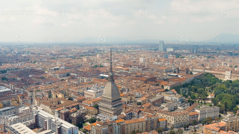 Турин, Италия. Mole Antonelliana - величественное здание 19-го века. Панорама города. Летний день, Aerial View