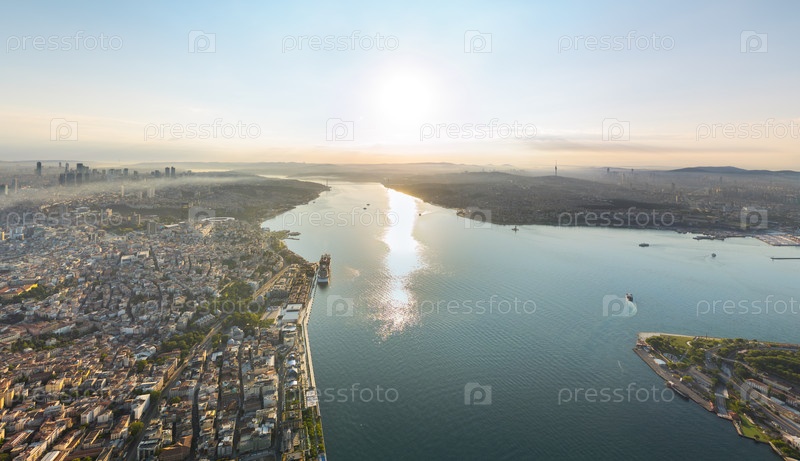 Босфорский мост (мост мучеников 15 июля), соединяющий Европу и Азию, вид из воздуха на пролив с крейсерским лайнером в якоре, отражение солнечного света на воде