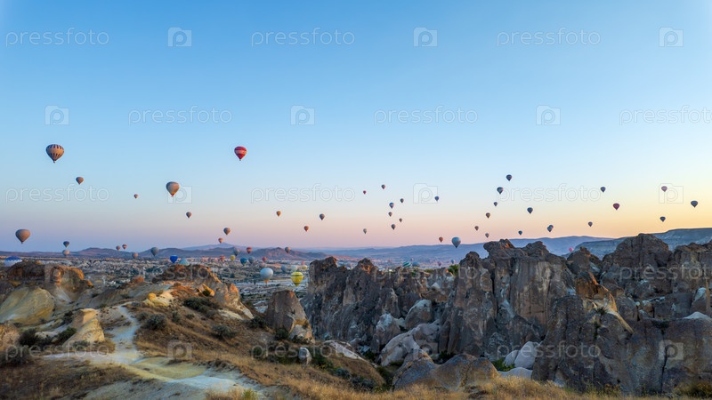 Первый свет восхода солнца освещает небо и скальные образования теплым светом, воздушные шары дрейфуют над каппадокийскими долинами, солнце скрыто за холмами