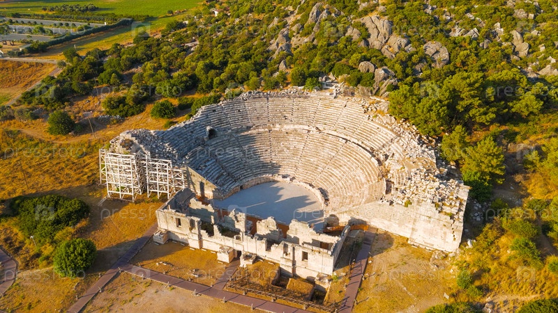 Гелемис, Турция.Древний театр Патары и холм Курсунлу в мягком утреннем свете, древние памятники и пейзажи летом.Вид с воздуха