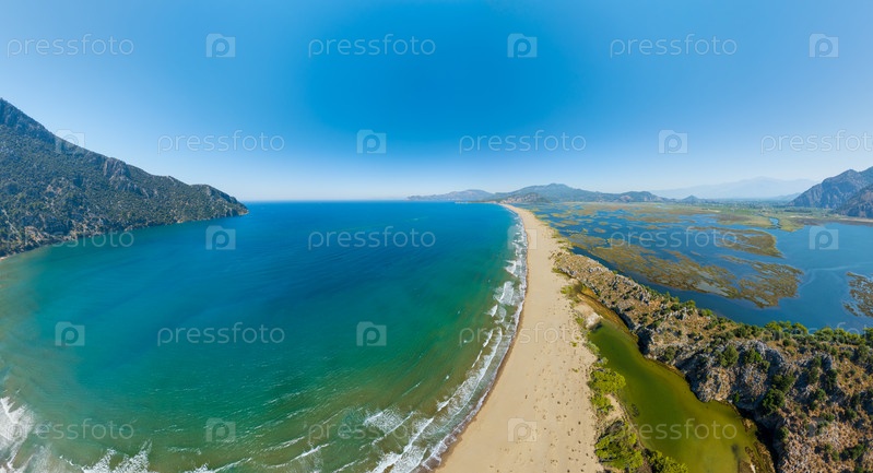 Панорамный снимок пляжа Изтузу, показывающий длинную береговую линию между рекой и морем с горным фоном
