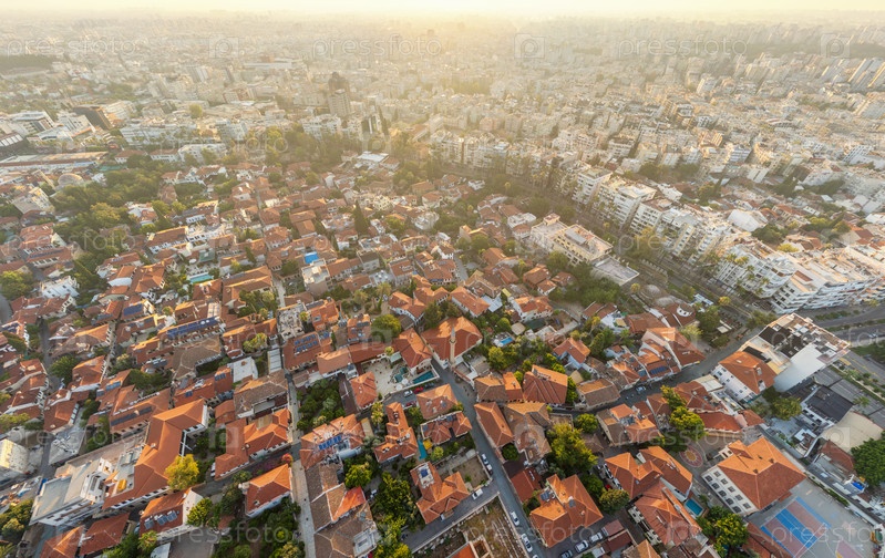 Анталья, Турция.Взгляд с воздуха, показывающий плотную историческую городскую ткань черепичных крыш Калейчи в переход к упорядоченной планировке новых жилых зон в летний день