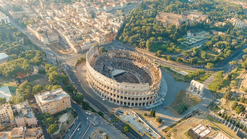 Рим, Италия. Римский Колизей. Полет над городом. Панорама города утром. Летом Aerial View
