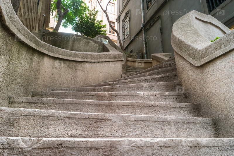 Истанбул, Турция. ближайший вид исторической лестницы Камондо снизу, изогнутые каменные ступени с рельсами из кованого железа, ведущими вверх, утренний свет, Галата