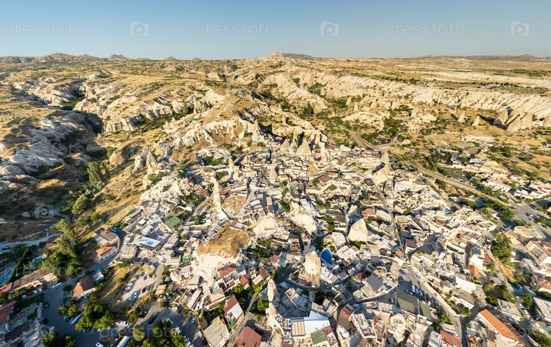 Широкий панорамный взгляд из воздуха на город Гореме, окруженный эродированными склонами долины и вулканической местностью в позднем утреннем свете