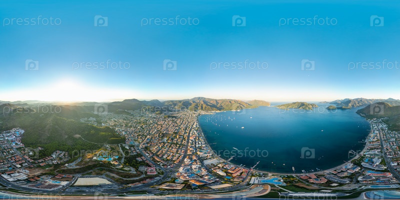 Панорамный вид на город, горы, залив с яхтами и береговую линию с пляжами под ярким закатом