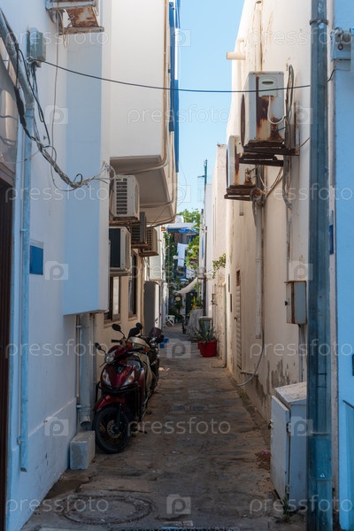 Очаровательная узкая улица в старом городе с белыми домами, припаркованными скутерами, декоративными терракотовыми горшками с зелеными растениями и традиционной каменной тротуарной дорожкой