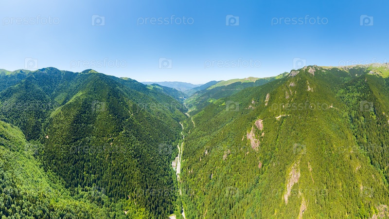 Альтиндере, провинция Трабзон, Турция. Парк долины Алтиндера. Изостоенный лес на склонах. Дорога через долину. Вид с воздуха