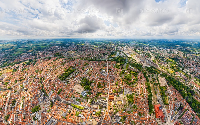 Брюгге, Бельгия. Центр города и его окрестности. Жилые и промышленные районы. Панорама на город. Летний день, облачная погода. Вид с воздуха