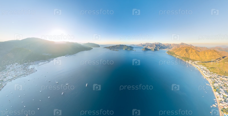 Панорамный взгляд из воздуха на город с восходом солнца за горами, береговой линией, заливом с Кенетом и островами Кечи. Утренняя сцена архипелага