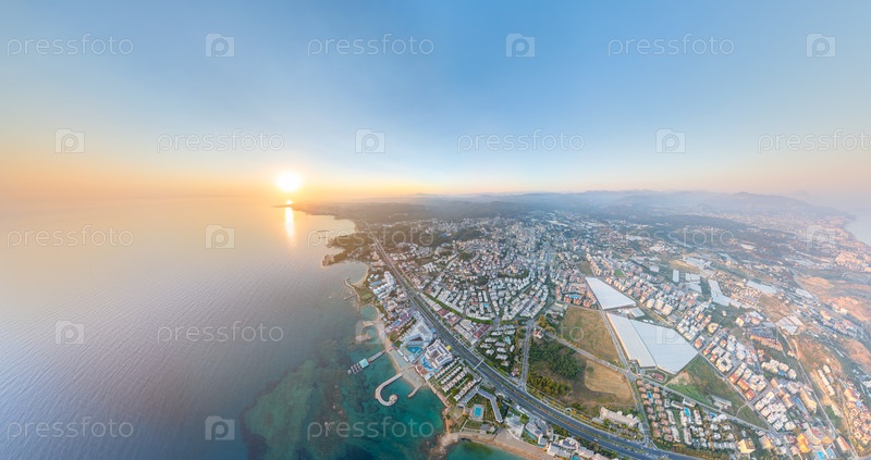 Авсаллар, Аланья, Турция. широкий панорамный закат с песчаными пляжами со зонтиками, прибрежными курортами и блестящим Средиземным морем. вид из воздуха