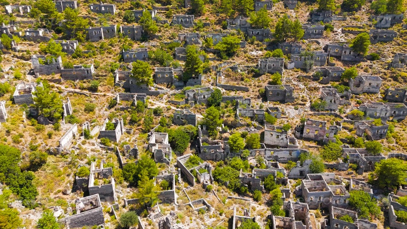 Каякой, Турция Вид с беспилотника на заброшенные каменные руины в необитаемом городе-призраке, окруженном деревьями на склонах гор, ясный день