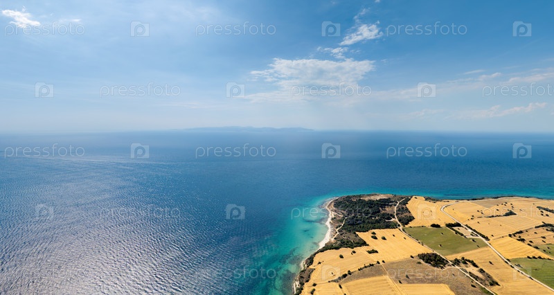 Вид с воздуха мыса Теке с полями, лесом и береговой линией на Мраморном море, остров Гокчеада виден в тумане на горизонте