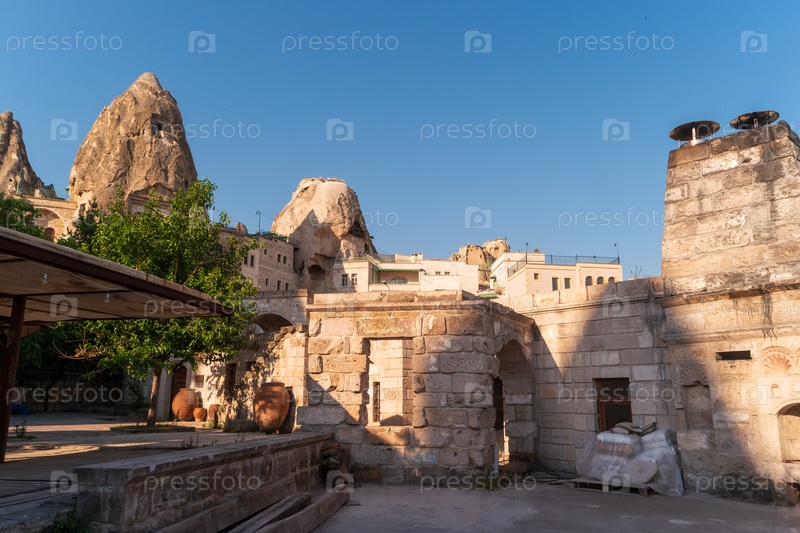Традиционная каменная архитектура с арочными дверями, терракотовыми горшками и затененной зоной со струнными огнями на фоне скальных образований под чистым голубым утренним небом