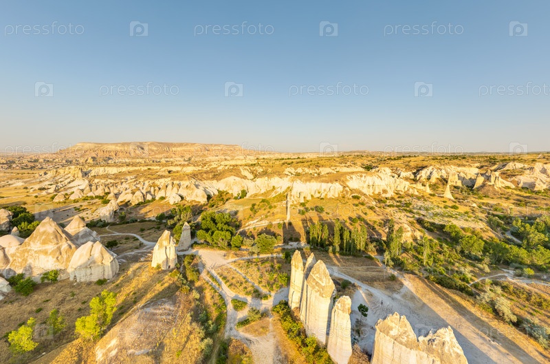 Панорамный вид с воздуха на Долину Любви с величественными скальными столбами, склонами долины и смотровой точкой Lovers Hill, купающейся в теплом свете заката