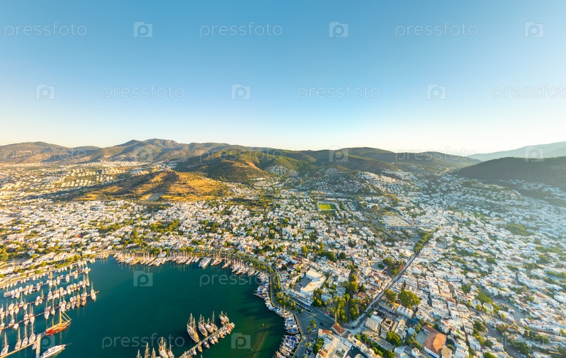 Бодрум, Турция.Утренний панорамный вид показывает марину, белые жилые дома, городскую зону и далекие горы в мягком утреннем свете