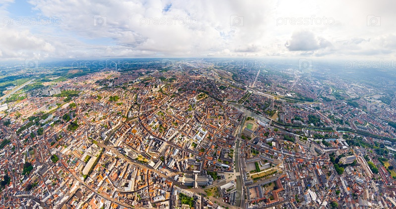 Гент, Бельгия. Центр города и его окрестности. Жилые и промышленные районы. Панорама на город. Летний день, облачная погода. Вид с воздуха