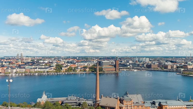 Стокгольм, Швеция. Стокгольмская ратуша и озеро Маларен. Панорама города. Летний день, Aerial View