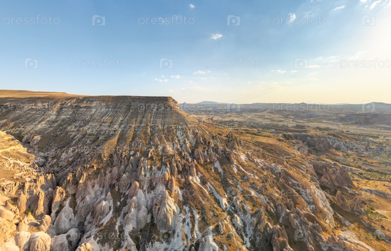 Гореме, Невшехир, Турция.Авиационный вид горы, купающейся в теплых цветах заката солнца с видом на Пасабагскую долину со сказочными дымоходами и разрушенными каньонами ниже