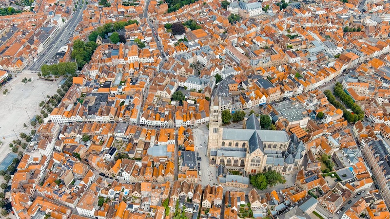 Брюгге, Бельгия. собор Святого Сальватора - собор XIV века с готической башней. панорама центра города из воздуха. облачная погода, летний день, Aerial View