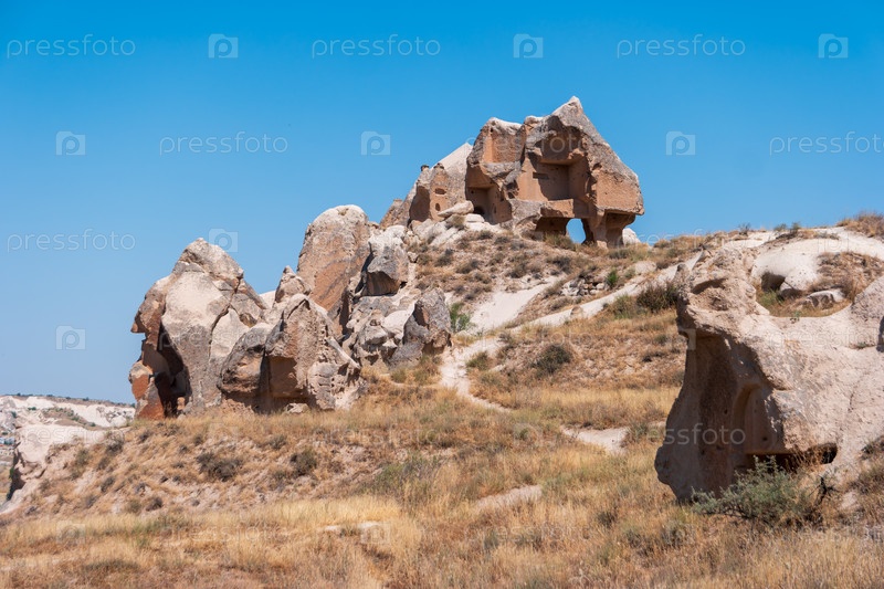 Ландшафт с разрушенными скальными образованиями, естественными арками и резными жилищами, сухой травой и кустарниками на переднем плане, ясное голубое небо